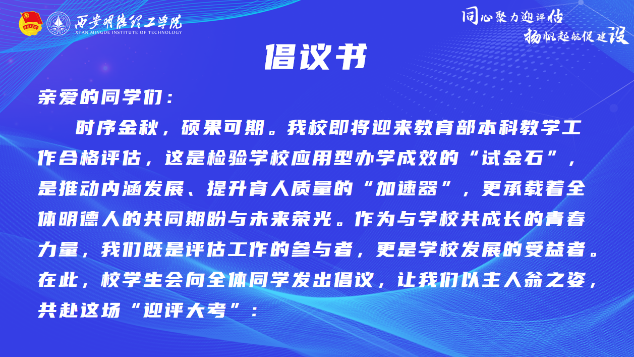 大会最后,校学生会的同学们宣读《以青春担当筑评估基石》倡议书,号召全体青年学子主动学习评估知识、积极参与学风建设、自觉维护校园文明,彰显“人人关心评估、人人参与评估”的责任担当。