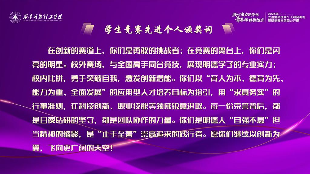 青春的画卷,在拼搏中铺展壮丽图景;榜样的精神,在岁月中沉淀不朽力量。这场会议,师生们欢聚一堂,共同见证先进集体与优秀个人的荣耀加冕,聆听他们以奋斗为笔书写的青春故事,领略明德青年朝气蓬勃、勇毅担当的昂扬风采。这些青春榜样,以笃行诠释初心,用实干追逐梦想,在学科竞赛中勇攀高峰,在志愿服务中传递温暖,在科研创新中攻坚克难,在社会实践中锤炼成长,生动践行着对理想的执着、对责任的坚守。他们的事迹,不仅是明德育人成效的鲜活注脚,更激励着全体师生在中国式现代化建设的征程中奋勇争先。表彰典礼从不是奋斗的终点,而是薪火相传的新起点。愿全体明德人汲取榜样力量,将崇敬与感动化为前行动能,以饱满热情深耕学业、精进事业,以坚定信念勇担使命、砥砺奋进,在学校本科教学合格评估的攻坚路上凝心聚力,在祖国繁荣发展的壮阔征程中添砖加瓦,共同书写无愧于时代、无愧于青春的精彩篇章!