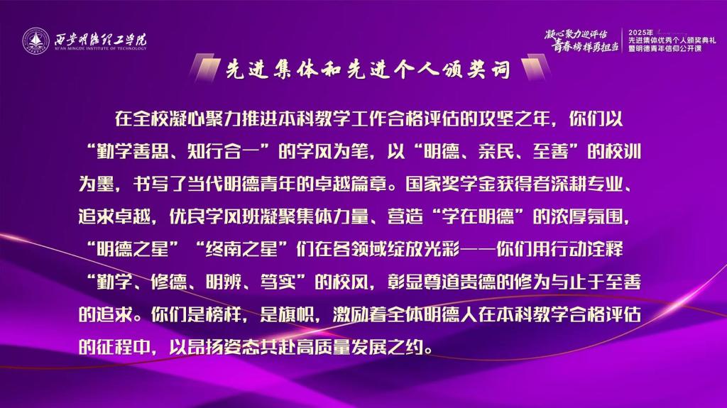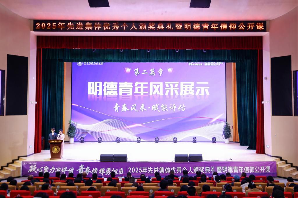 为表彰先进,树立榜样,激励更多青年学子奋勇前行,12月10日,学校在四季廊桥报告厅举行“凝心聚力迎评估 青春榜样勇担当”2025年先进集体、优秀个人颁奖典礼暨明德青年信仰公开课,表彰过去一年师生群体中涌现的先进集体和优秀个人,共同见证明德学子的收获与成长。