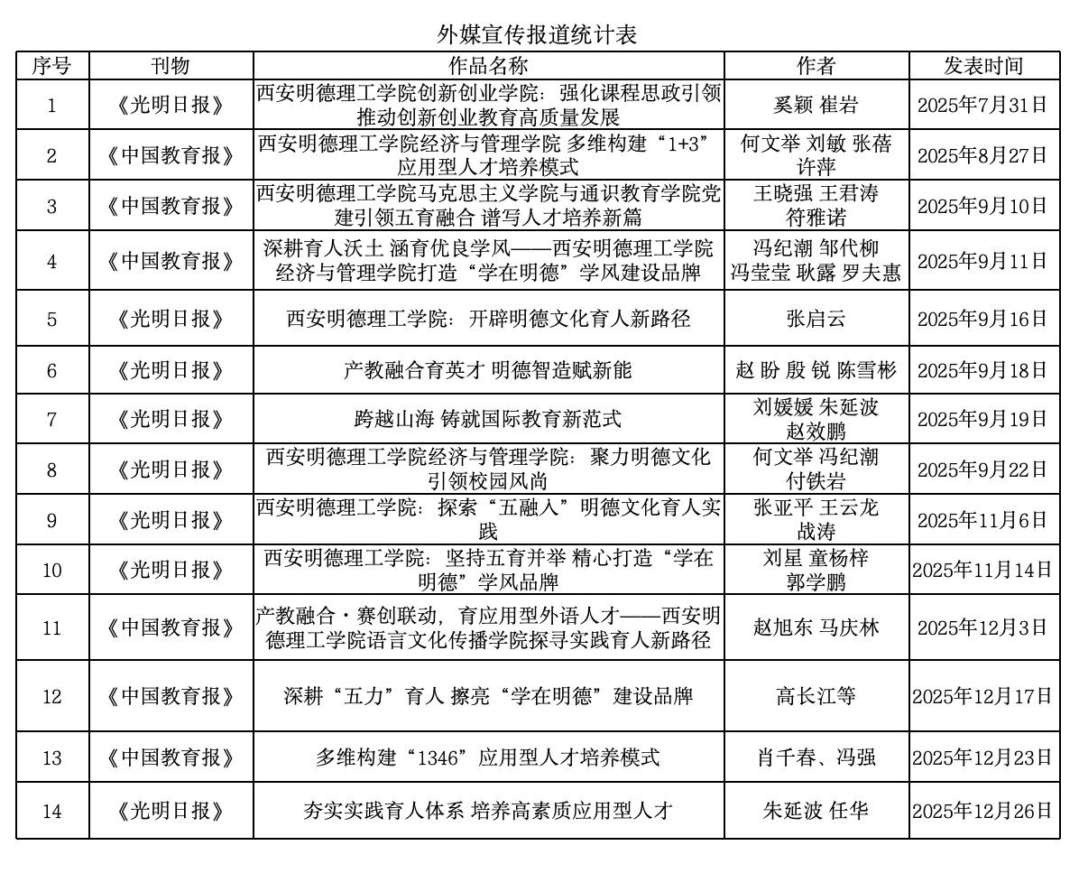学校围绕建设特色鲜明高水平应用型大学、培养高素质应用型人才目标定位,深化OBE教育理念,完善应用型人才培养体系,在人才培养、师资队伍建设、校企合作、产教融合、协同育人等方面成效显著。荣膺“2025年度综合实力应用型高校”荣誉称号。在软科高校排名中稳居全国民办高校第一方阵。全年被光明日报、中国教育报、陕西日报等报刊报道14次,荣获陕西高校新闻奖8项,品牌影响力与社会美誉度持续提升。