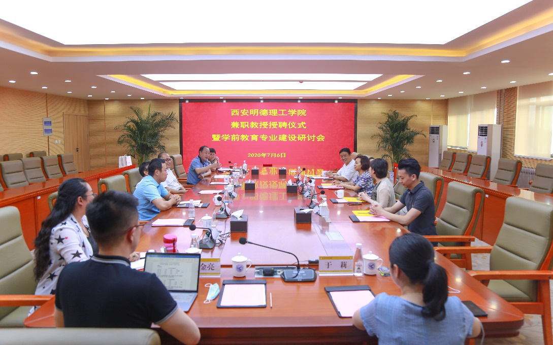 7月6日下午,西安明德理工学院聘任西北工业大学幼儿园园长王莉女士、副园长戴翠玲女士、保教主任沈俊女士为学院兼职教授。兼职教授聘任仪式暨学前教育专业申报及相关人才培养、教育条件建设、实习实训基地等研讨会在明志楼第一会议室召开。学院院长张渤、党委书记杨健君、副院长薛康、党委副书记董昊、董事长助理兼教务科研部部长庾鲜海、院长助理兼学院办公室主任支晓等参加研讨会。我院创始人之一,西安阳光慧园集团公司董事长兼总经理张博先生,副总经理张曦元先生专程前来参加授聘仪式和研讨会。会议由薛康副院长主持。