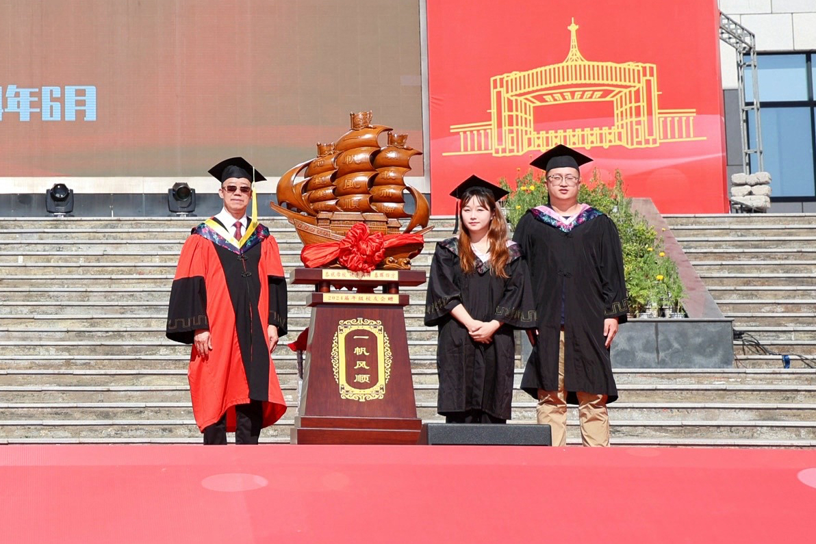 学校董事长袁汉源为2024届优秀毕业生代表颁发荣誉证书并合影留念。