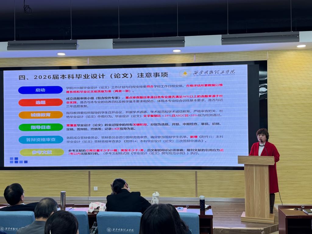 关于2026届毕业论文启动工作,柴重点强调:严守质量标准严格落实学校相关文件要求教师应严把选题关指导关,有计划、有组织地落实指导任务、加强监督。同时,对实验室讲解视频录制、网站数据更新、试卷与论文调阅规范、校企合作实习基地建设等诊断评估重点任务作出工作安排。她强调,学院上下要以高度责任感积极配合,为即将到来的数据核查和诊断评估提供坚实保障。