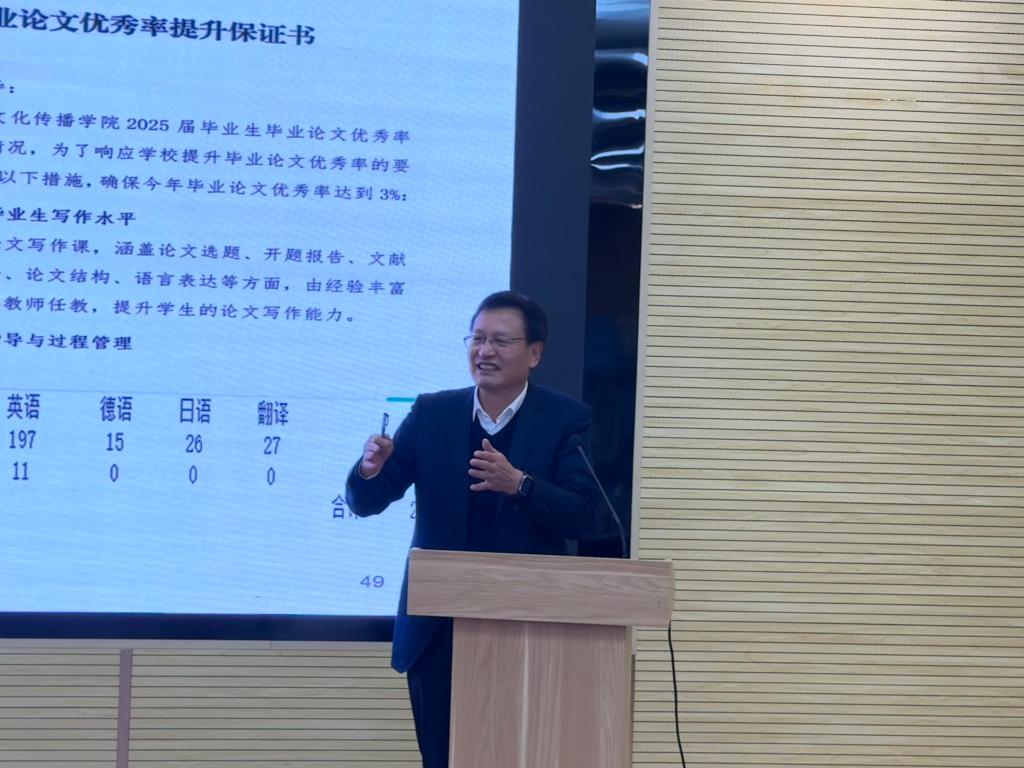 为全面落实学校教学质量建设要求,扎实推进期中教学检查、毕业论文管理及诊断评估各项准备工作,1114下午,语言文化传播学院在6号楼201召开2025-2026-1学期期中教学检查及迎接诊断评估工作布置大会。会议由学院党委书记赵旭东主持,学院全体教职工参会。