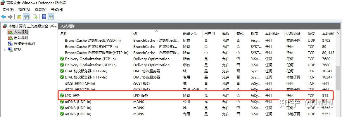 Windows防火墙上也会出现名为“LPD”服务的入站规则,开放了TCP 515端口: