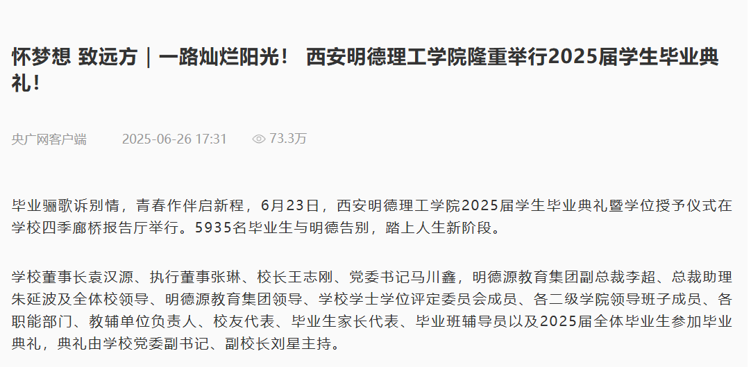 毕业骊歌诉别情,青春作伴启新程,6月23日,西安明德理工学院2025届学生毕业典礼暨学位授予仪式在学校四季廊桥报告厅举行。5935名毕业生与明德告别,踏上人生新阶段。