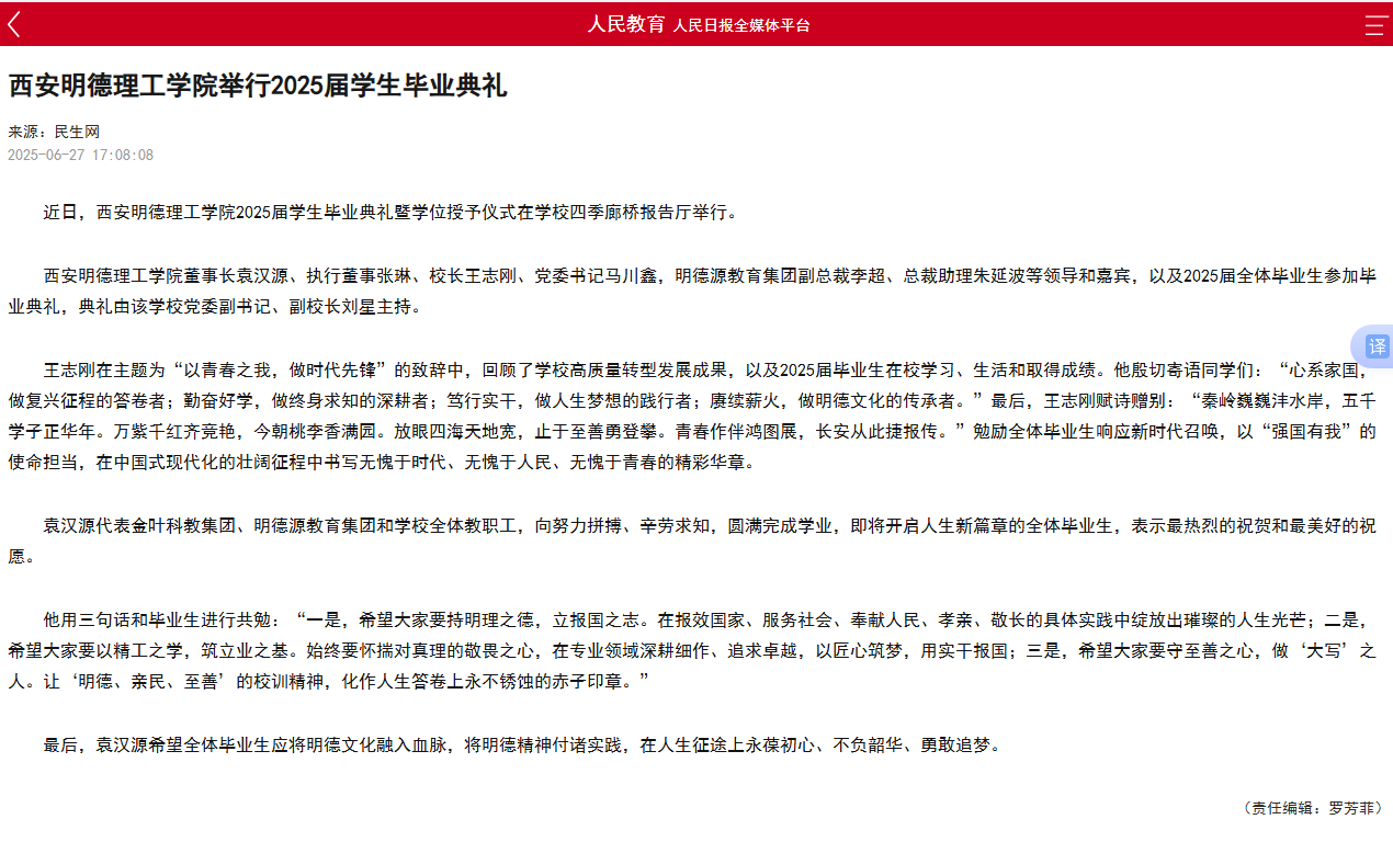 【人民教育】西安明德理工学院举行2025届学生毕业典礼