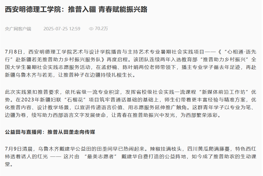 7月8日,西安明德理工学院艺术与设计学院播音与主持艺术专业暑期社会实践项目——《“心相通·语先行”赴新疆若羌推普助力乡村振兴服务队》再度启程。该团队连续两年入选教育部“推普助力乡村振兴”全国大学生暑期社会实践志愿服务活动,在孟舒楠、陈叶娟两位老师带领下,播主专业学子循去年足迹,再赴新疆乌鲁木齐与若羌,让推普种子在边疆持续扎根生长。