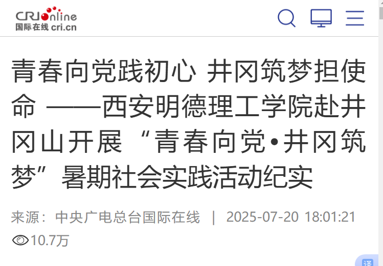 巍巍井冈,翠竹挺拔。2025年7月17日,西安明德理工学院马克思主义学院樊静老师带领7名青年学子踏上革命圣地江西井冈山,正式开启“青春向党•井冈筑梦”暑期社会实践活动。作为2025年“井冈情•中国梦”全国大学生暑期实践专项行动的重要组成部分,此行旨在引导青年学子在追寻红色足迹中深刻感悟井冈山精神,筑牢信仰根基,赓续红色血脉。
