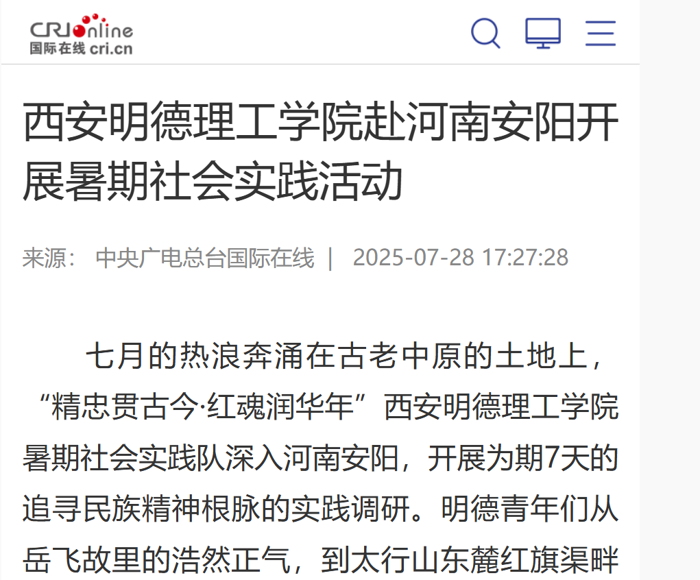 七月的热浪奔涌在古老中原的土地上,“精忠贯古今·红魂润华年”西安明德理工学院暑期社会实践队深入河南安阳,开展为期7天的追寻民族精神根脉的实践调研。明德青年们从岳飞故里的浩然正气,到太行山东麓红旗渠畔的奋斗史诗,从乡村振兴示范村到科技企业前沿,以脚步丈量历史厚度,用行动阐释青春担当,深刻体悟“精忠报国”在新时代的磅礴伟力。