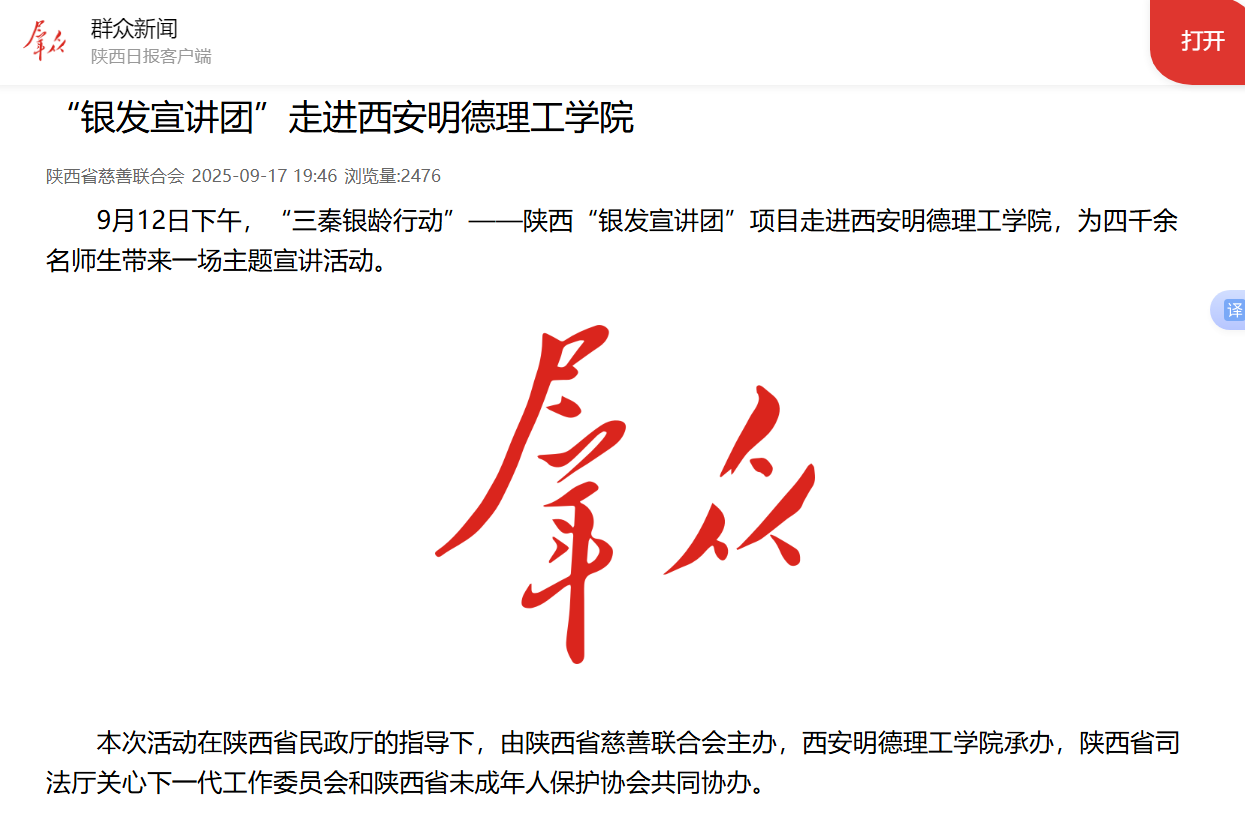 9月12日下午,“三秦银龄行动”——陕西“银发宣讲团”项目走进西安明德理工学院,为四千余名师生带来一场主题宣讲活动。