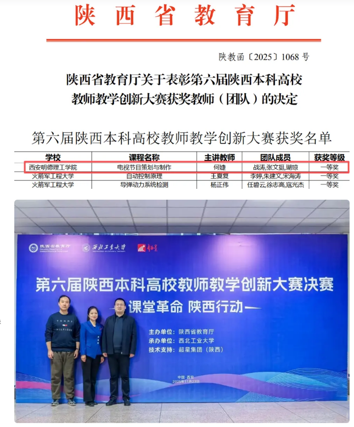 近日,第六届陕西本科高校教师教学创新大赛结果公布,学校艺术与设计学院何婕教师团队凭借《电视节目策划与制作》课程,从全省参赛选手中脱颖而出,荣获省级一等奖。这是学校继2018年之后,再次摘得该项赛事的省级一等奖殊荣。这一成绩的取得,充分展示了学校近年来深化本科教学改革、提升教师教学创新能力的显著成效。
