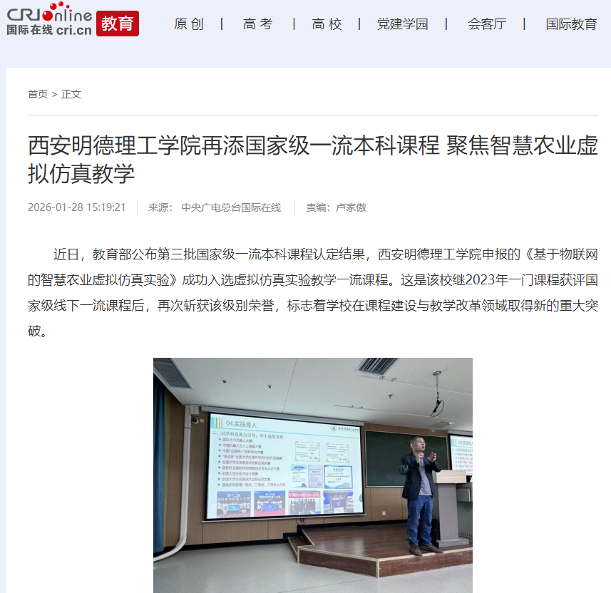 近日,教育部公布第三批国家级一流本科课程认定结果,西安明德理工学院申报的《基于物联网的智慧农业虚拟仿真实验》成功入选虚拟仿真实验教学一流课程。这是该校继2023年一门课程获评国家级线下一流课程后,再次斩获该级别荣誉,标志着学校在课程建设与教学改革领域取得新的重大突破。