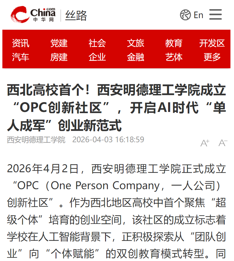 2026年4月2日,西安明德理工学院正式成立 “OPC(One Person Company,一人公司)创新社区”。作为西北地区高校中首个聚焦“超级个体”培育的创业空间,该社区的成立标志着学校在人工智能背景下,正积极探索从“团队创业”向“个体赋能”的双创教育模式转型。同时,为应用型本科院校的人才培养提供具有参考意义的实践案例。