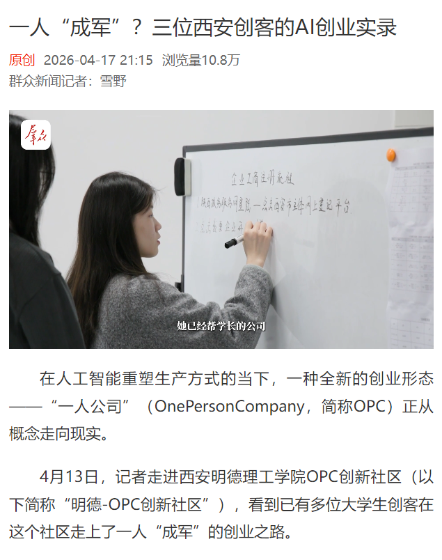 从高新区到高校,西安正在织起一张支持个体创业的创新网络。明德-OPC创新社区面向全校寻找“超级个体”——无论是能用AI辅助写代码的“编程孤狼”,能独立完成脚本、拍摄、AI后期剪辑的“数字导演”,还是拥有创新想法、坚信AI能实现梦想的学子,都能在这里找到创新创业主场。