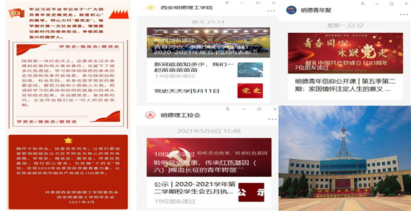 抓住“切入点”,动作到位。坚持线上线下同频共振。开设党史学习教育专题网站,及时发布校园两级党组织开展的形式丰富的党史学习教育动态,深入宣传各级党组织在活动中好的经验做法,在官方微信和二级单位微信公众号开通“党史天天学”“倾听党史故事,传承红色基因”“明德青年信仰公开课”等栏目。同时利用校内电子屏幕,宣传栏,横幅等宣传阵地,多角度宣传党史学习教育内容。