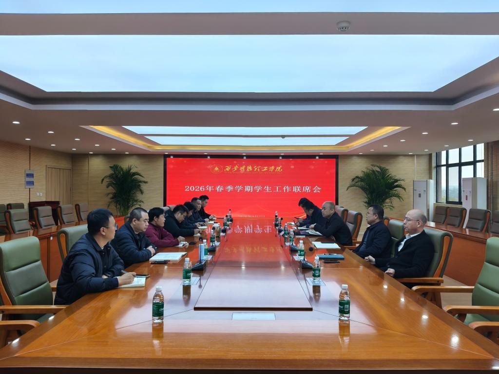 为统筹部署2026年春季学期学生工作,压实各部门工作责任,凝聚育人工作合力,3月2日下午,学校在明志楼518会议室召开2026年春季学期学生工作联席会。党委学生工作部、教务处、后勤管理处、智慧安全警务处负责人及各学院党委(党总支)副书记参加会议。会议由童杨梓主持。