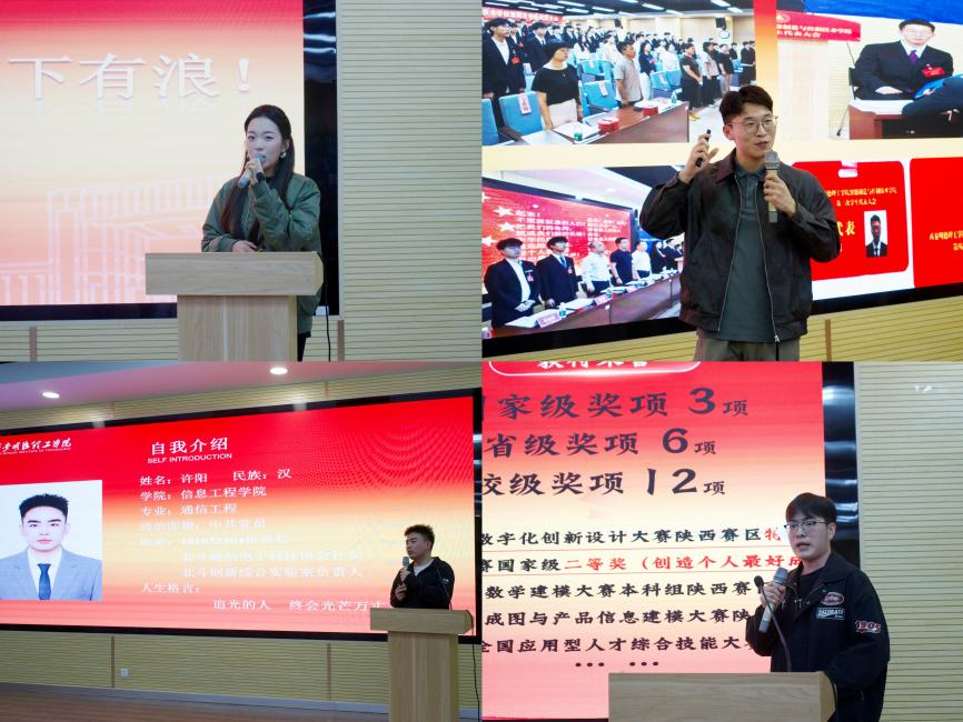 随后,四位国家奖学金获得者分享了各自的成长经验。信息工程学院李雨璇以《厚植于思 深耕于学 奔涌于行》为题,分享了英语四六级备考与学习方法;许阳在《学赛双向奔赴,青春滚烫前行》中,讲述了平衡理论学习与竞赛实践的心得。智能制造与控制技术学院段宇彤围绕《以学筑基 以赛促学》,阐述了如何融通专业学习、学科竞赛与社会实践;段立国则以《路漫漫其修远兮,吾将上下而求索》为题,结合学生工作与竞赛经历,分享了全面发展的心路历程。在随后的互动环节,同学们围绕时间管理、竞赛入门等话题踊跃提问,学长学姐给予了细致解答,现场气氛热烈。四位宣讲人的故事朴实而深刻,经历真实而动人,他们用奋斗的笔触书写了精彩的青春篇章,为在场同学提供了可学、可感、可及的成长范本。