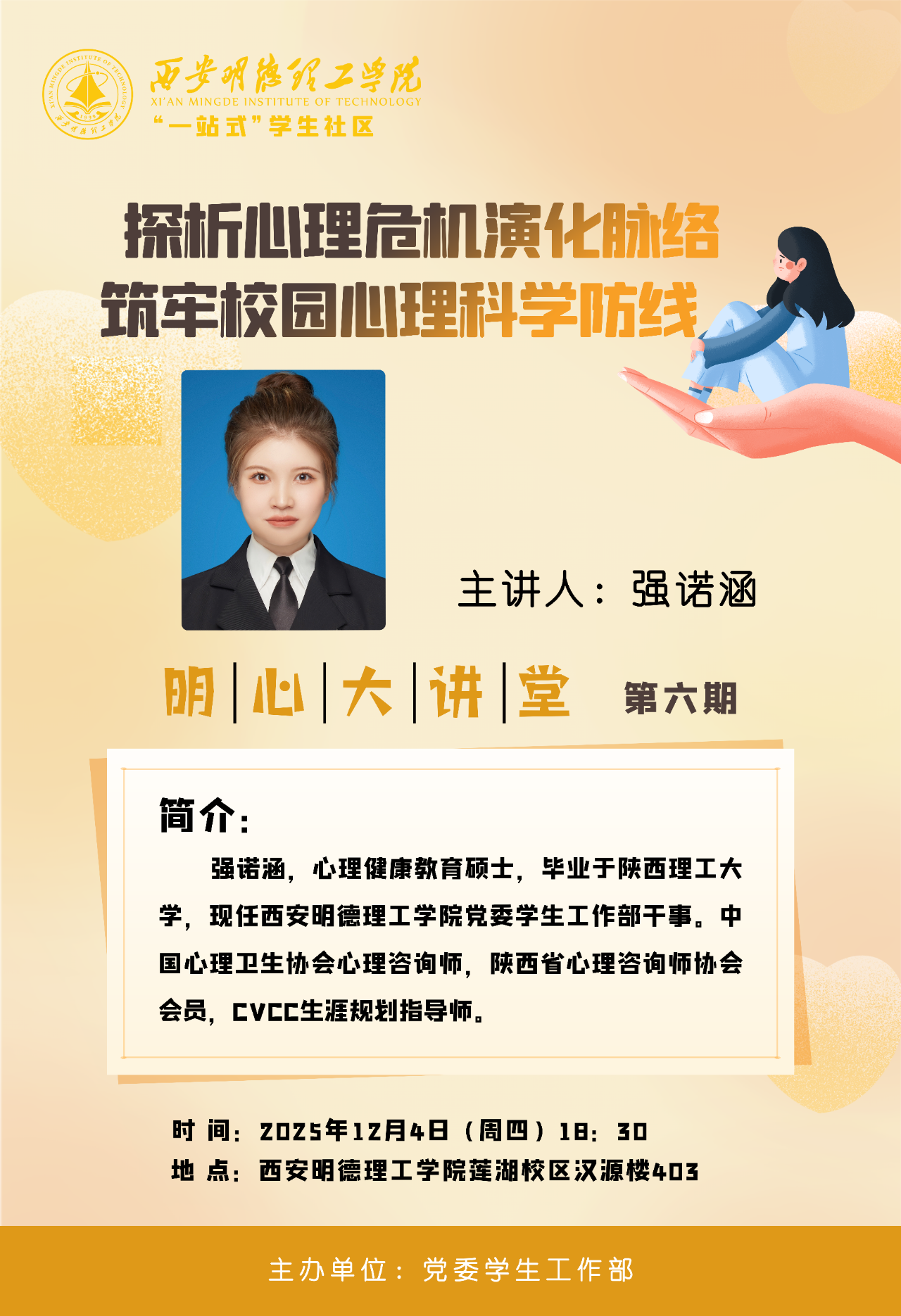 一、培训时间2025年12月4日 18:30二、培训地点西安明德理工学院莲湖校区汉源楼403三、报告会专家党委学生工作部 强诺涵四、培训对象 明德科技职业学院班级与宿舍心理委员周四我们不见不散~