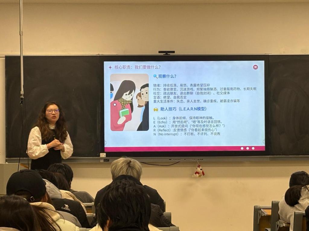 培训伊始,强老师以“心理委员是什么、做什么、怎么做”为切入点,清晰界定了心理委员的角色定位。她指出,心理委员是连接教师与学生群体的“桥梁纽带”,是校园心理危机预防的“前哨探头”,更是身边同学心理健康的“温暖守护者”。