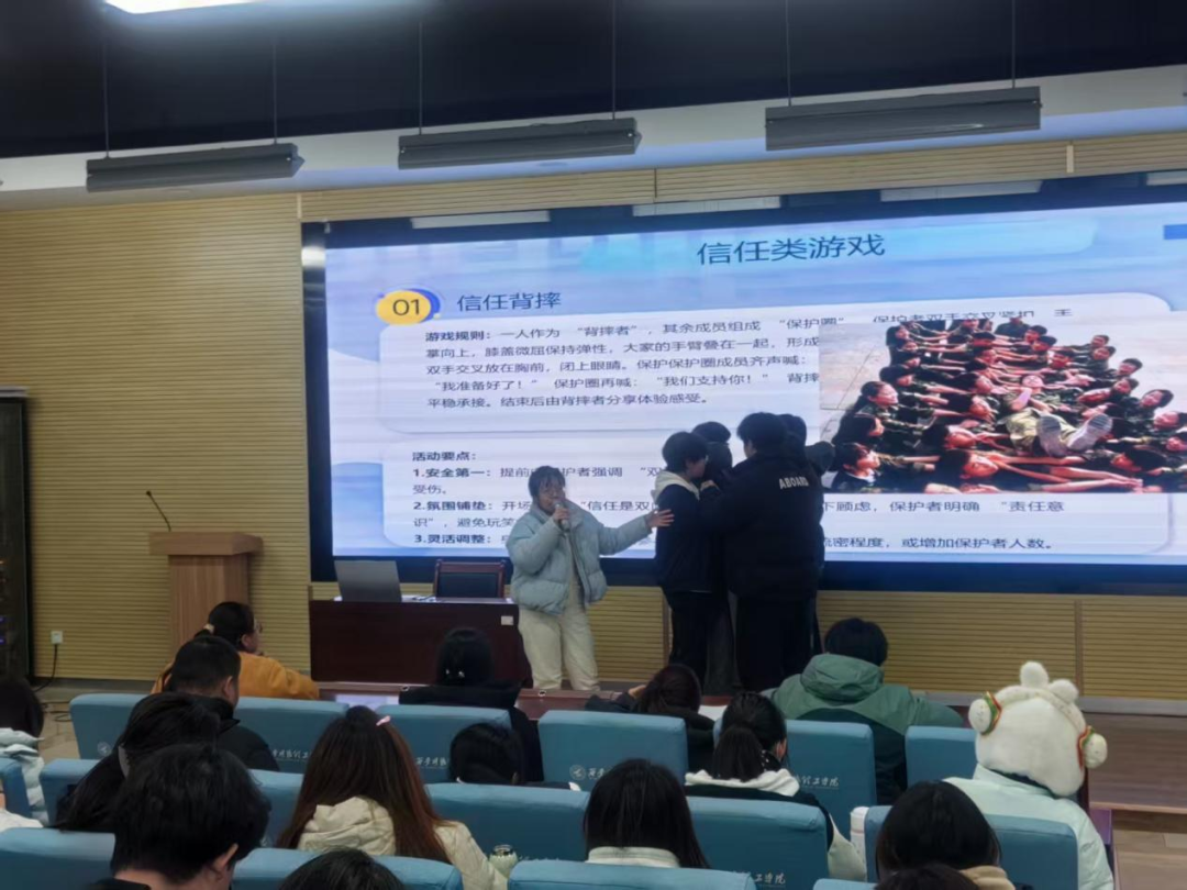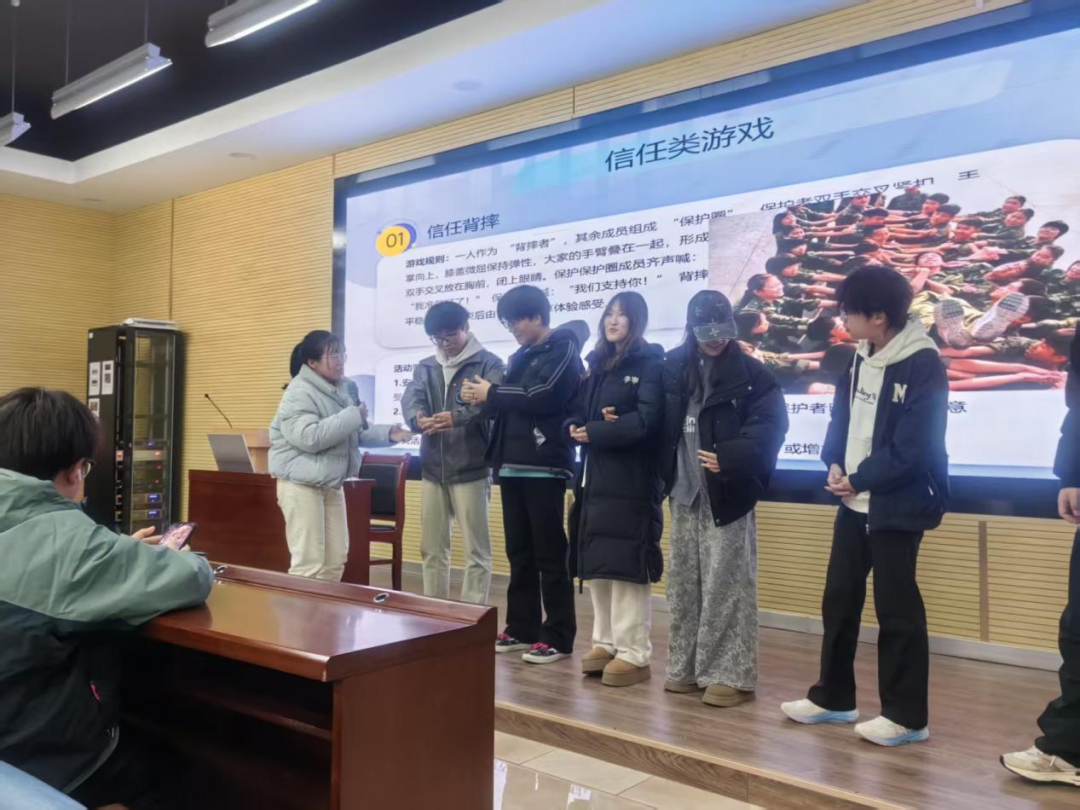 培训伊始,曹老师清晰界定了心理团体活动的定义、核心目标,适用场景,并强调团辅活动设计需遵循“以学生需求为导向、趣味性与实效性相结合”为原则,为参训人员搭建起系统的理论认知框架。接下来,结合不同的团体活动场景,曹老师介绍了破冰类、协作类、信任类等不同功能的团体游戏,并邀请现场同学体验游戏,在愉快的氛围中,大家掌握了游戏规则与实施要点。