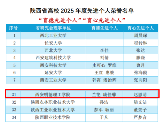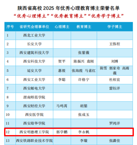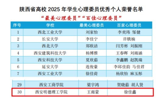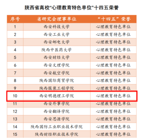 近日,陕西省高校心理素质教育研究会印发《关于公布“十四五”期间和2025年度心理健康教育工作先进单位和个人荣誉名单的通报》,我校心理育人工作成果突出,荣获陕西省高校“十四五”心理教育特色单位。