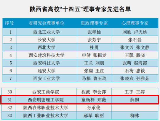 省研究会对陕西省高校“十四五”心理育人先进个人予以表彰。我校学工部部长童杨梓,通识教育学院院长郑薇被评为陕西省高校“十四五”思政理事专家,通识教育学院副院长薛飘获评心理理事专家。