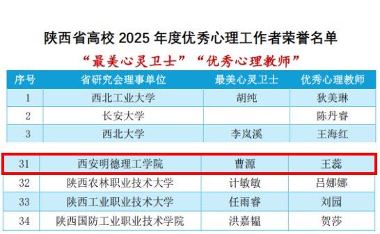 大学生心理健康教育中心曹源老师荣获“最美心灵卫士”,通识教育学院王蕊老师获评“优秀心理教师”。