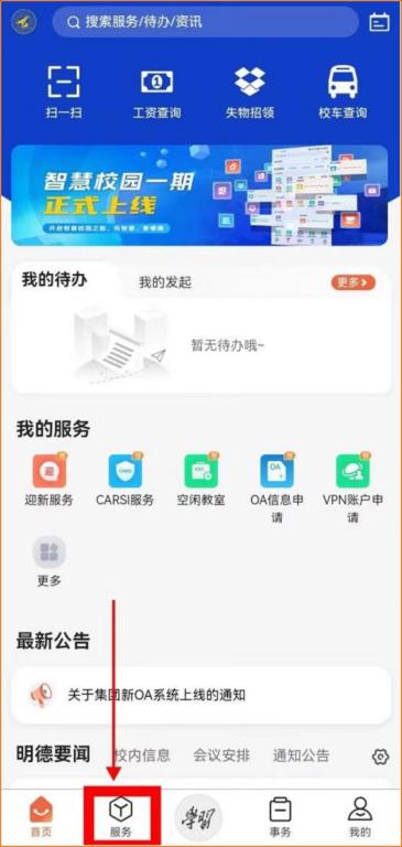 1.登录“西安明德理工学院融合服务门户”,点击下方“服务”。