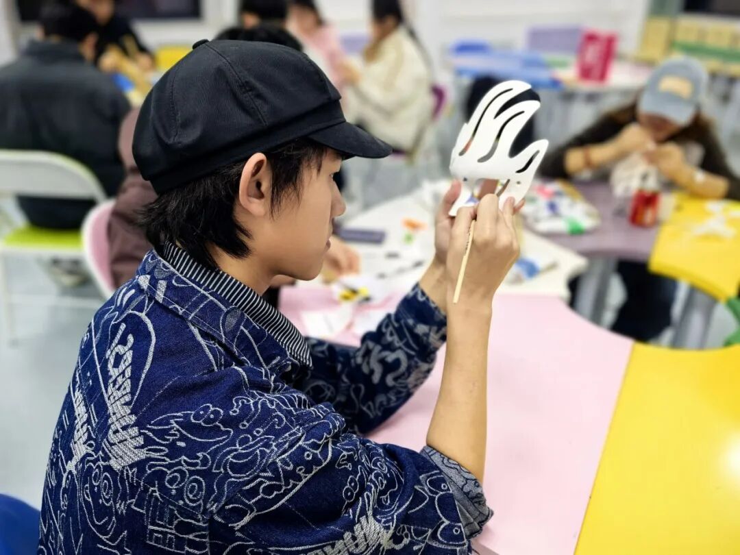 活动以“情绪盲盒”破冰游戏开始,同学们通过相互提问猜测情绪关键词,增进对自我与他人的理解。随后进行面具绘制环节,学生以色彩与线条在面具上表达近期情绪,完成情绪的可视化呈现。