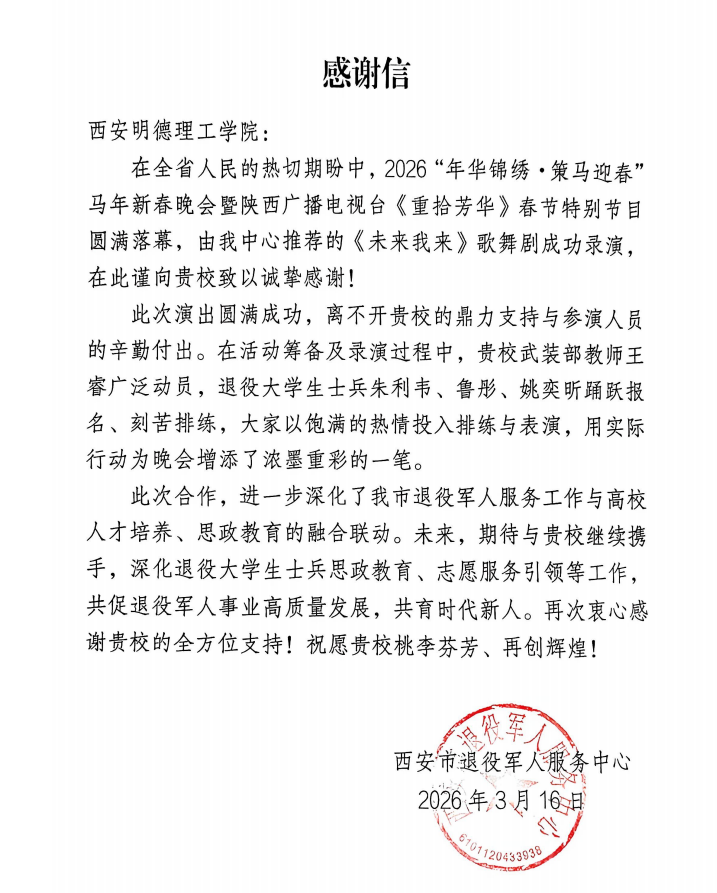 近日,市退役军人服务中心专程发来感谢信,对我校明德学子在相关工作中展现出的责任担当与优良风貌给予高度赞扬,为明德学子的出色表现诚挚点赞,这也充分彰显了我校在国防教育与退役军人服务融合工作中取得的扎实成果。