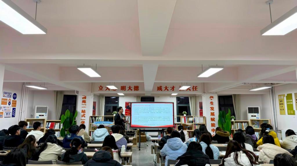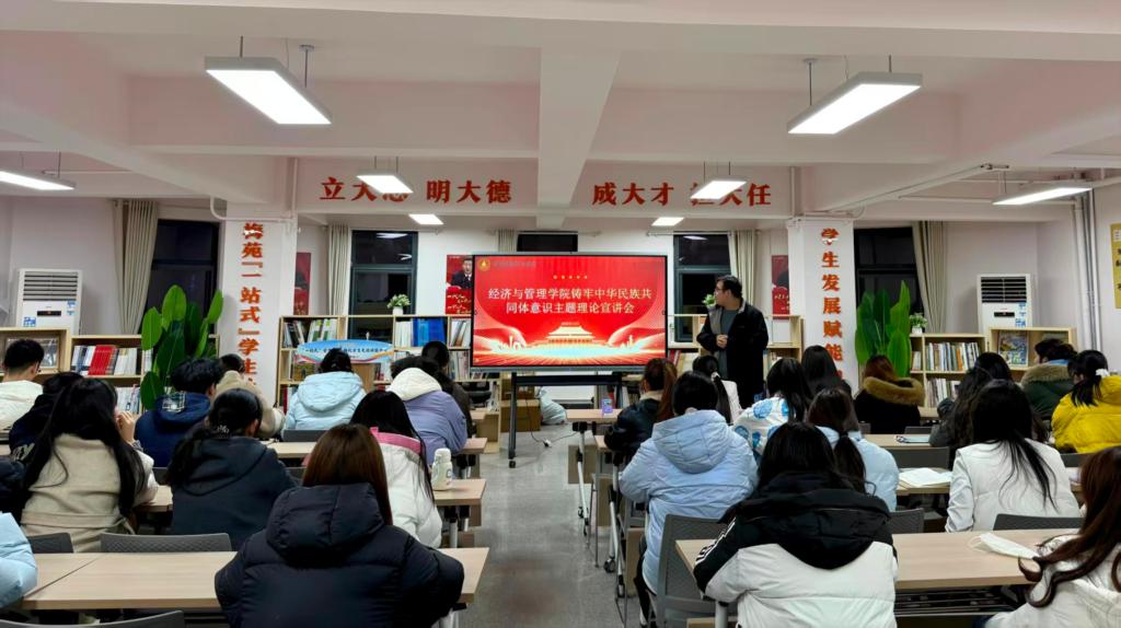 12月1日晚,经济与管理学院在“一站式”学生社区梅苑学生发展赋能中心开展铸牢中华民族共同体意识理论宣讲教育活动,各年级50余名学生代表参加了活动,活动由辅导员井小林主持。
