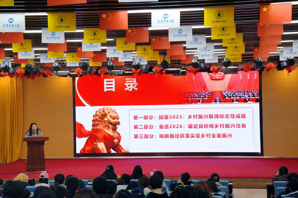 景怡欣老师聚焦乡村振兴这一国计民生的重中之重,作了题为《从“国之大者”到“民之关切”:以青春之我,助力和美乡村建设》的宣讲。她系统回顾了2025年作为“十四五”收官之年,我国在巩固脱贫攻坚成果、提升民生保障水平、夯实农业基础等方面取得的标志性成就。重点阐述了2026年“十五五”开局之年乡村振兴的核心任务,为实现这些目标,景怡欣老师从强化政治引领、做强产业支撑、推动政策落地、强化人才保障、提升治理效能、锤炼过硬作风六个方面,清晰勾勒了抓落实、促振兴的实践路径,激励青年将个人成长与乡村全面振兴的伟大实践紧密结合。