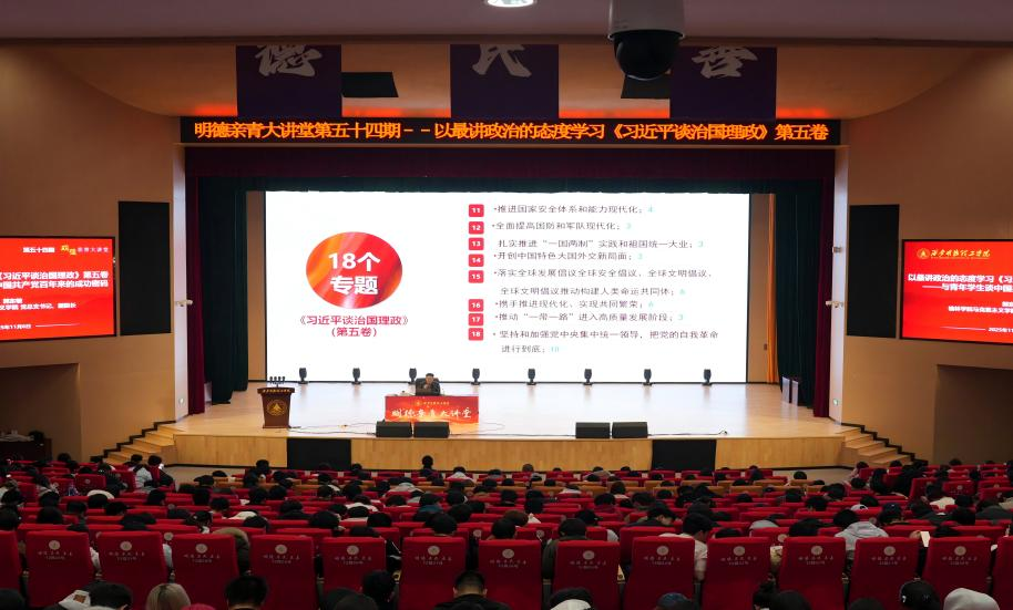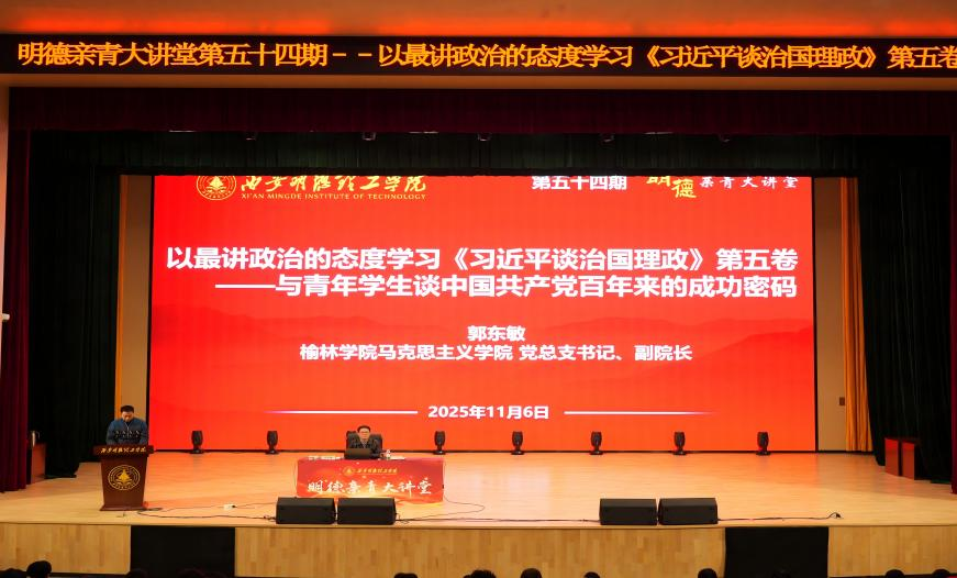 2025年11月6日晚,我校第五十四期“明德亲青大讲堂”在四季廊桥报告厅隆重举行。本次讲座邀请到西北大学博士、陕西优秀思政课教师、第二届陕西省党史专家库成员、共青团陕西省委讲师团成员、榆林市委理论宣讲人才库成员、榆林学院马克思主义学院党总支书记、副院长、副教授、硕士研究生导师郭东敏作题为“以最讲政治的态度学习《习近平谈治国理政》第五卷——与青年学生谈中国共产党百年来的成功密码”主题讲座。讲座由信息工程学院党委副书记高长江主持。