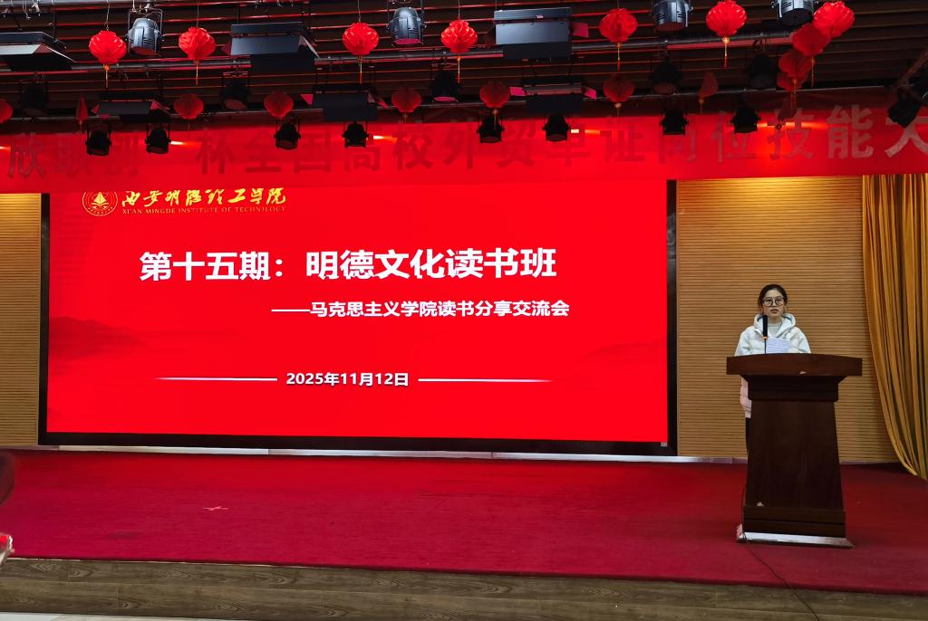 为深入学习贯彻习近平新时代中国特色社会主义思想,全面落实党的二十大精神、二十届三中全会精神、二十届四中全会精神,进一步激发同学们的阅读热情,弘扬社会主义核心价值观,推进“书香明德”校园文化建设。11月12日中午,西安明德理工学院马克思主义学院读书分享交流在建德楼203教室顺利举行,王璐、张启云、龚玲三位经验丰富的思政课教师携经典著作倾情分享,与现场学子共赴书香之约,在墨香氤氲中共探真理光芒,在思想碰撞中感悟精神伟力。