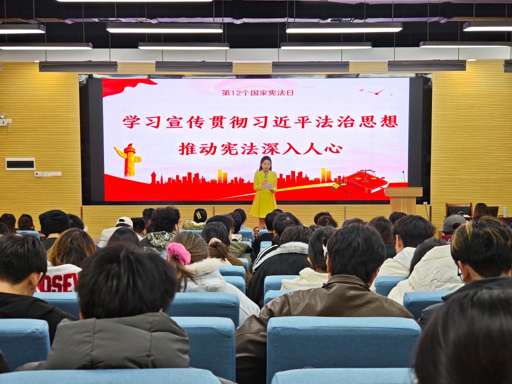2025年12月4日是第十二个国家宪法日。为深入学习宣传贯彻党的二十大精神和习近平法治思想,大力弘扬宪法精神、维护宪法权威,西安明德理工学院马克思主义学院于2025年12月3日,组织开展了“宪法宣传周”专题法律宣讲活动。本次活动由马克思主义学院主办、德法同行社、齐越朗诵社团协办,共举行两场专题宣讲,内容涵盖民法典、网络安全、数据安全、法治教育等多个领域,旨在提升师生法治素养,营造尊法学法守法用法的校园氛围。活动累计吸引了近200百名学生参与,现场气氛热烈,师生互动频繁,充分展现了校园法治教育的生动活力。