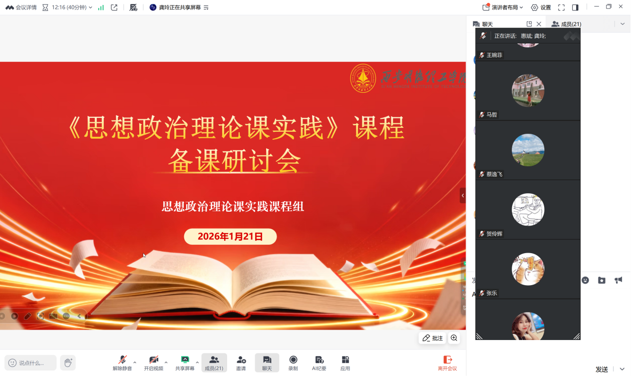 为切实提升《思想政治理论课实践》课程的教学质量与育人成效,推动实践教学向体系化、专业化纵深发展,1月21日晚20时,思想政治理论课实践课程组通过腾讯会议平台召开了备课研讨会。会议由毛泽东思想和中国特色社会主义理论体系概论教研室主任龚玲主持,课程组全体教师参加会议。