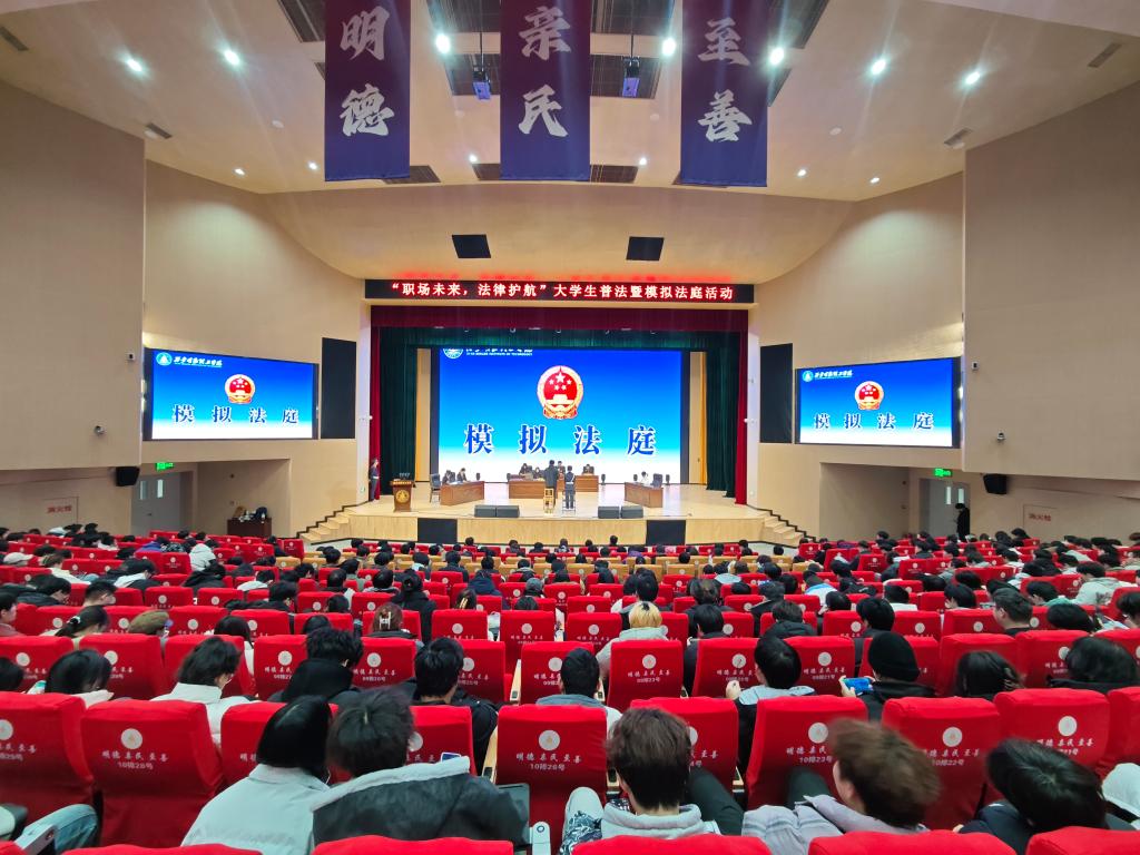 2025年12月15日晚,四季廊桥报告厅座无虚席,“职场未来·法律护航”大学生普法暨模拟法庭活动在此举行。作为宪法宣传周的核心实践环节,本次活动创新采用“沉浸式庭审体验+精准化专题宣讲”的模式,旨在通过实践深化大学生法治意识,助力其筑牢职场发展的法律防线。