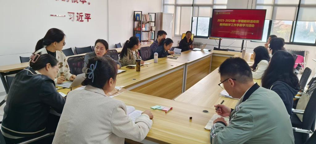 为深入贯彻西安明德理工学院教育方针,进一步规范教师的教学行为、提升教师的业务质量、夯实教师专业素养,10月13日,通识教育学院物理教研室在0号楼306会议室开展了“2025-2026学年第一学期教研活动暨教师教学工作手册学习”活动。本次活动以“教学工作手册深度学习与实践应用”为核心聚焦点,旨在通过系统性学习、针对性研讨与实践性解读,引领全体教师精准把握教学规范要求,将手册内容转化为优化教育实践的有效路径。