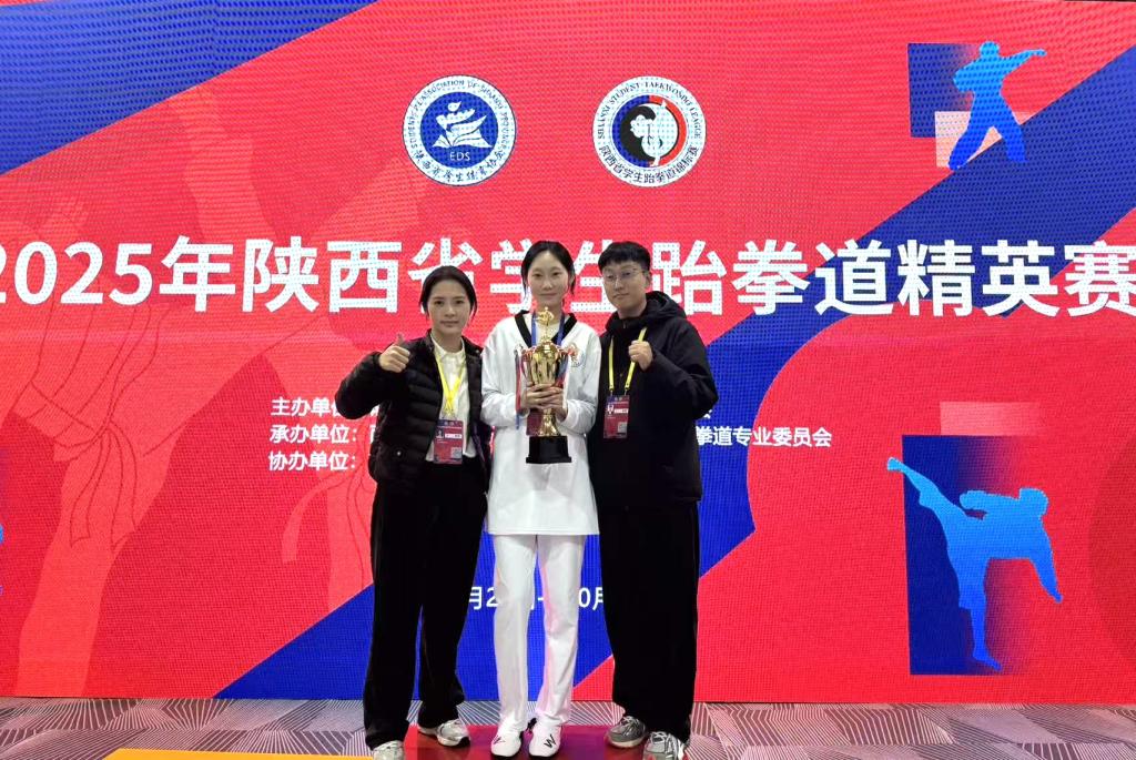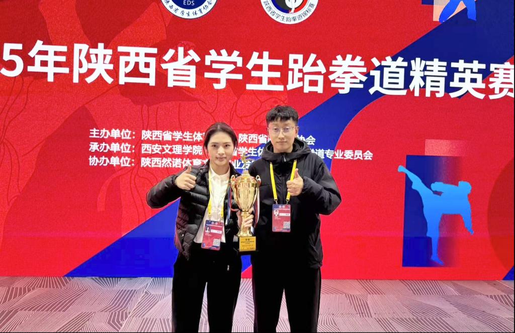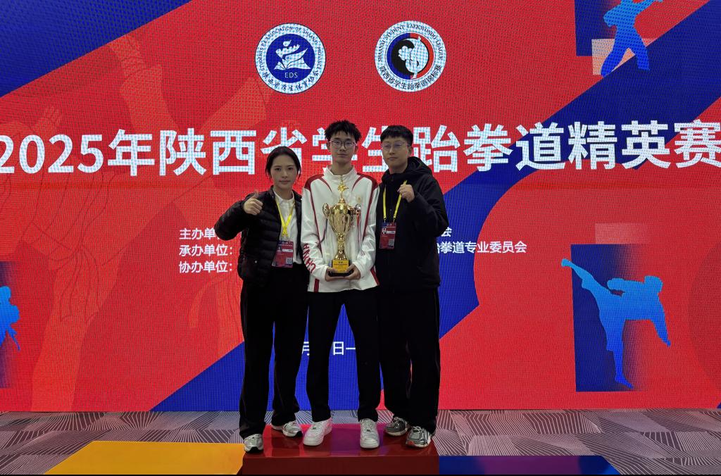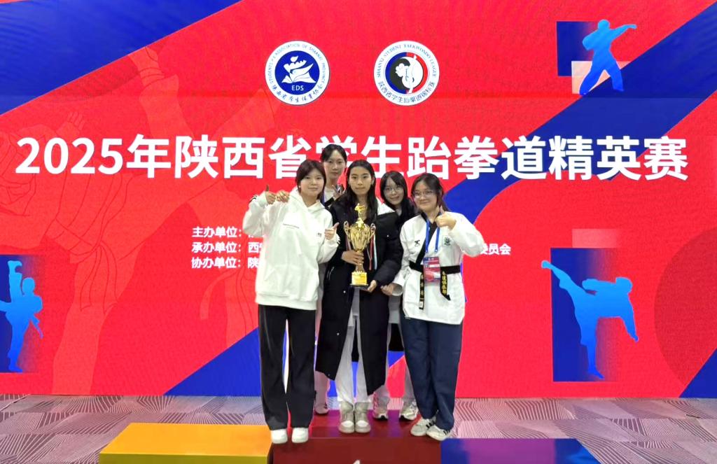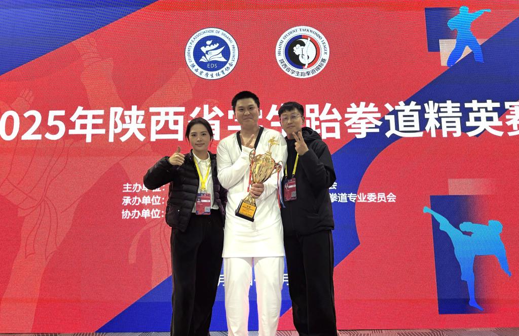 2025年陕西省学生跆拳道精英赛于10月26日在嘉会国际交流中心圆满落幕,全省30余所高校齐聚于此,在竞技与品势项目中展开巅峰对决。我校跆拳道校队在马俊豪、王静妍两位教练员的带领下,14名参赛队员凭借扎实的功底与顽强的斗志,在此次比赛中狂揽四金三银三铜,并且获得团体总分第三名,创造了我校跆拳道队的历史最佳成绩。