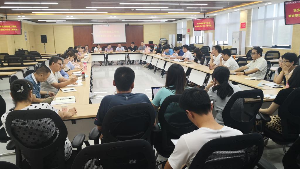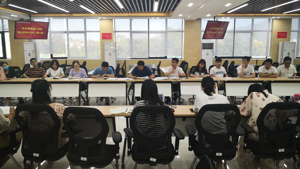根据西安明德理工学院院字【2020】29号文件精神,通识教育学院于2020年9月4日下午在明志楼南311(学术报告厅)开展教育思想大讨论。参加此次大讨论的人员除了通识教育学院全体员工外,邀请了学院党委副书记董昊老师,招生就业办公室副主任王东辉老师,终南书院执行院长张涛老师、图书馆副馆长强丽丽老师、借阅科科长郭晓延老师,网络信息化中心信息管理办公室科长滕华老师。会议由总支书记王君涛老师主持。