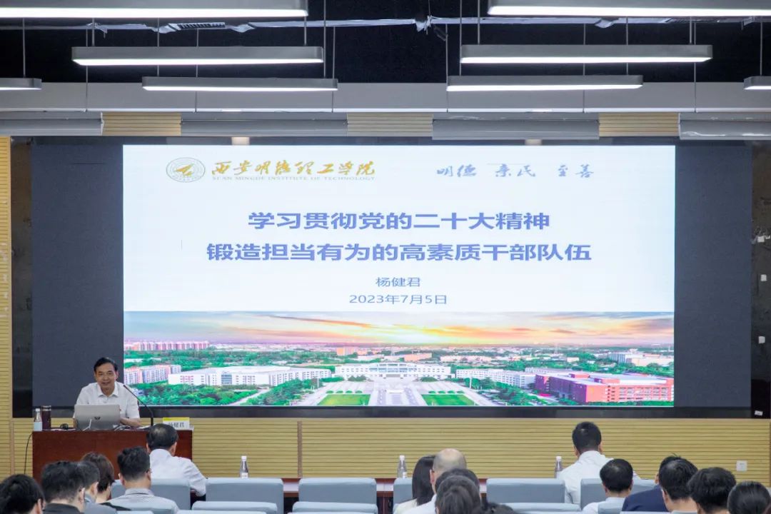 杨健君校长以《学习贯彻党的二十大精神,锻造担当有为的高素质干部队伍》为题作了专题辅导报告。他说,党的二十大报告首次将教育、科技、人才三位一体进行部署,为新时代教育、科技、人才工作指明了方向。习近平总书记在主持中央政治局集体学习时强调,教育兴则国家兴,教育强则国家强。建设教育强国,龙头是高等教育,要健全中国特色教师体系,造就一支师德高尚、业务精湛、结构合理、充满活力的高素质专业化教师队伍。