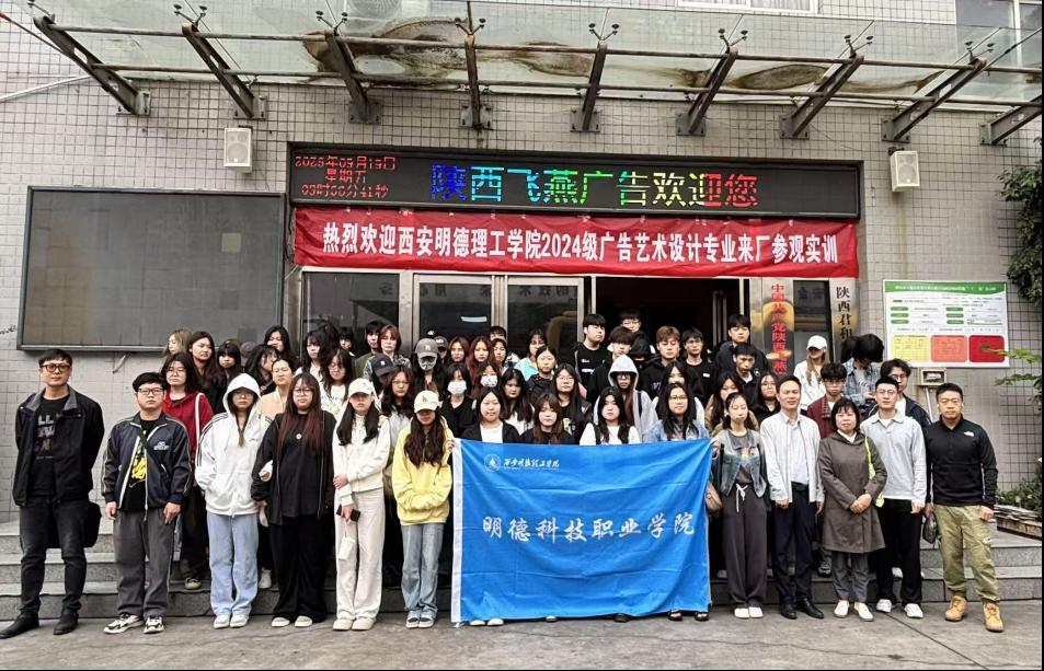 2025年9月17日,西安明德理工学院明德科技职业学院2024级广告艺术设计专业师生一行86人,在专业负责人舒粉利教授的带领下赴陕西飞燕广告有限公司开展认知实习活动。本次活动旨在帮助学生深入了解广告行业的发展动态与设计制作流程,进一步明确未来职业方向,为学生个人发展规划奠定坚实基础。