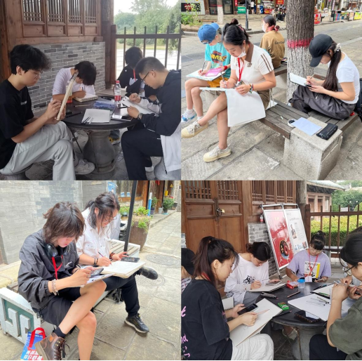 在专业老师的带领下,学生们迅速投入到写生实践中。他们支开画架,选取自己中意的风景,开始构思起第一笔颜料的落笔之处。专业老师不仅指导学生们如何选取角度、构图,还详细讲解了色彩搭配的技巧,确保每一幅作品都能准确传达出古城的风貌和韵味。