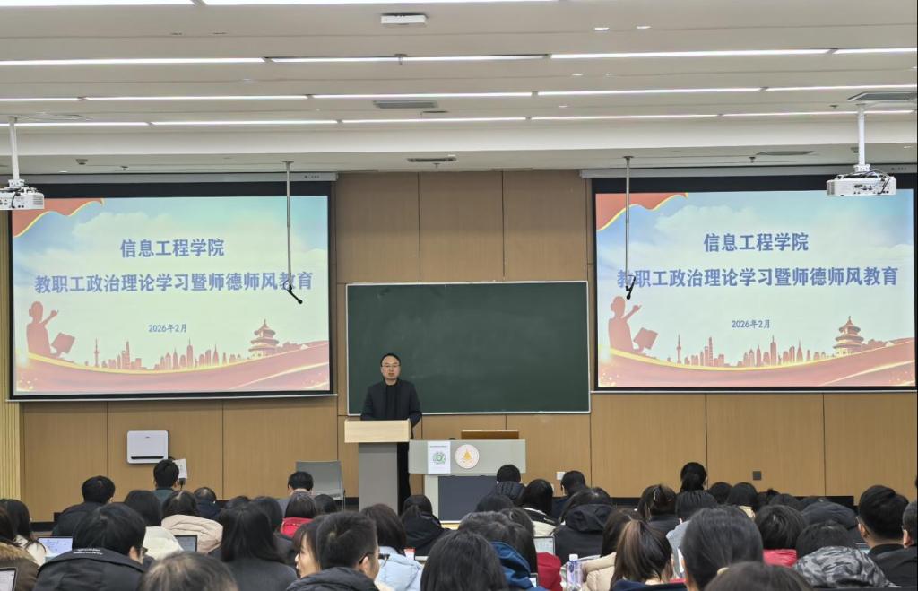 2月28日下午,信息工程学院召开2025-2026学年春季学期全院教职工大会。会议全面总结2025年度工作成效,部署新学期重点任务,统一思想、凝聚共识、鼓足干劲,为学院高质量发展与本科教学工作合格评估保驾护航。学院领导班子成员及全体教职工参会,会议由学院党委书记肖千春主持。