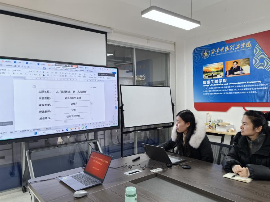 分享环节中,七位课程负责人结合课程特色与育人目标,带来了深入浅出、特色鲜明的案例分享,生动展现了信息类课程知识传授与价值引领的有机融合《算法分析与设计》负责人马蕾老师,通过经典算法的演进比较,引导学生领悟“最优解背后的系统思维与全局观念,厚植科学精神与工匠精神;《光纤通信》负责人吕瑛老师,串联我国光通信领域从追赶到领先的奋斗历程,将科技报国情怀与自主创新意识自然融入技术原理讲解;《数字信号处理》负责人周欣老师,以“信号去噪”“特征提取”为喻,引导学生在信息时代明辨是非、坚守本心,培育人文素养与社会责任感;《数据结构》负责人李茹老师,借数据结构的高效组织与应用,诠释“整体与部分“秩序与效率”的辩证关系,传递协同合作的集体主义精神;《C语言程序设计》负责人王曙光老师,聚焦代码规范、逻辑严谨与工程伦理的内在关联,在培养计算思维的同时,筑牢学生诚信严谨的职业道德根基;《通信原理》教师孙维菊老师,从“编码-传输-解码”全流程切入,引申信息传递的准确性与责任感,凸显通信技术对社会连结与进步的推动作用;《计算机软件基础》负责人卫霞老师,围绕软件生态、知识产权保护等主题,引导学生认识自主可控软件体系建设的战略意义,树立科技自立自强的远大志向。分享结束后,与会教师围绕思政元素的无痕融入、教学案例的设计技巧、成效评价方法等关键问题展开热烈讨论,在思想碰撞中凝聚育人共识。