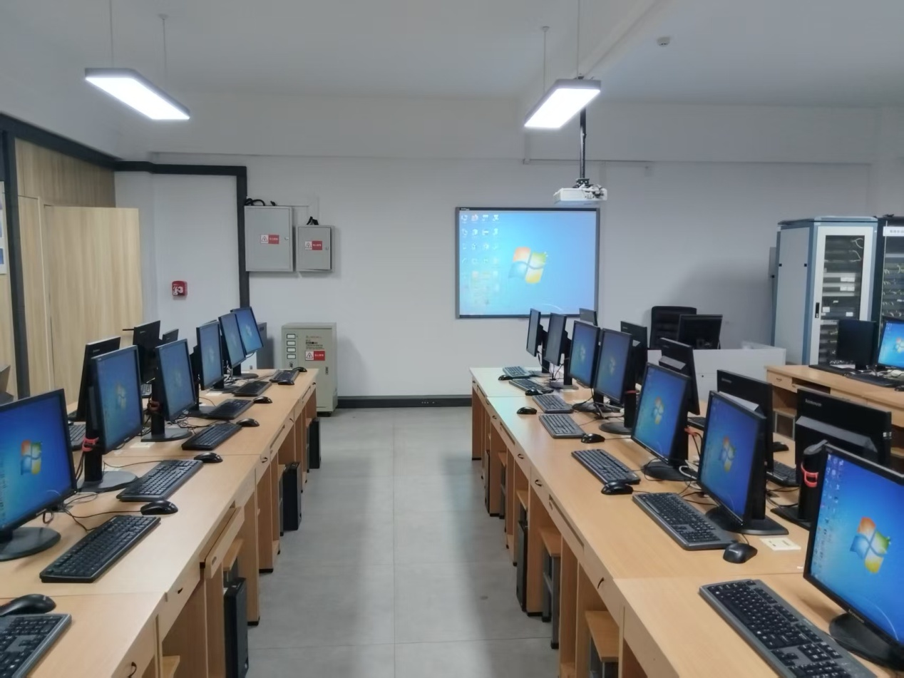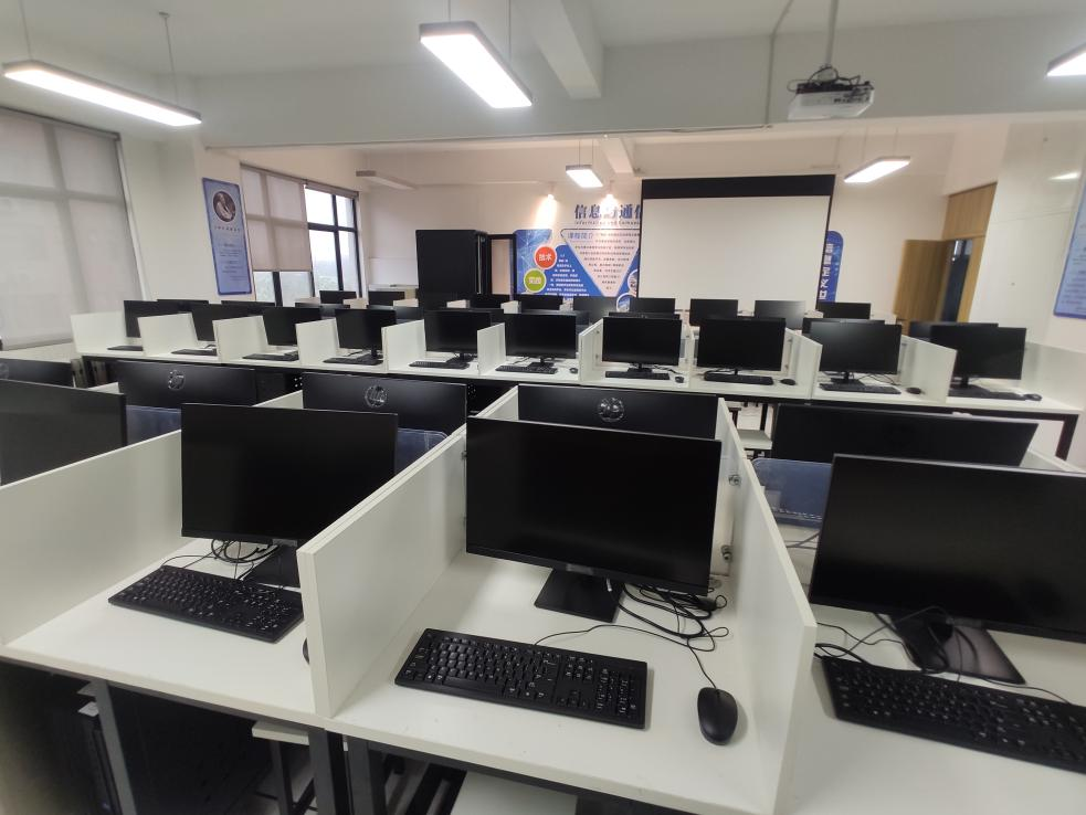 ICT综合实验室位于明心楼南404,占地面积136.4平米,是我院计算机类专业实验室。现有教师机1台,服务器2台,学生机48台,配备多媒体教学系统。主要用于开展计算机类相关课程的实验教学,教学用计算机安装有当前常用的JAVA、Python、数据库等相关开发工具,以满足不同实验课程的需求。